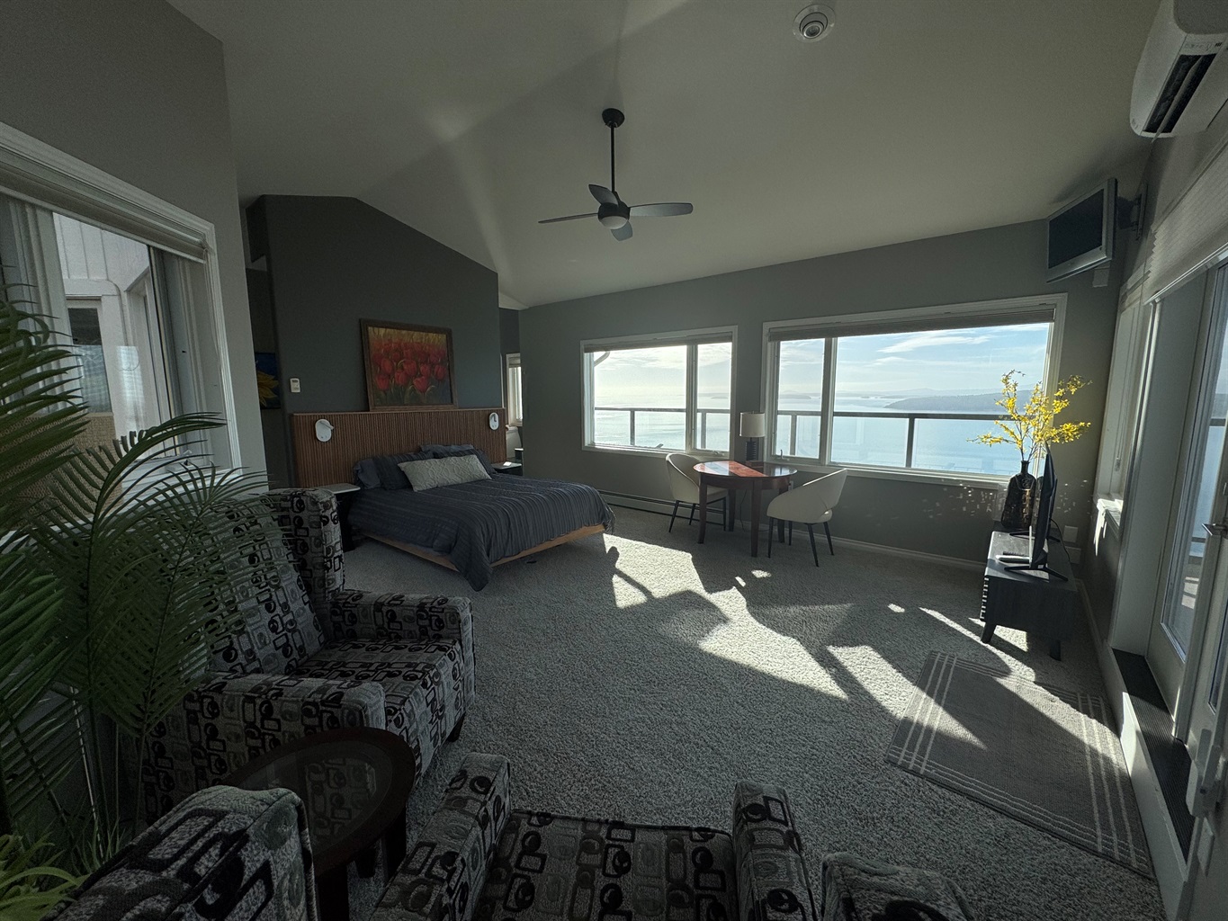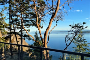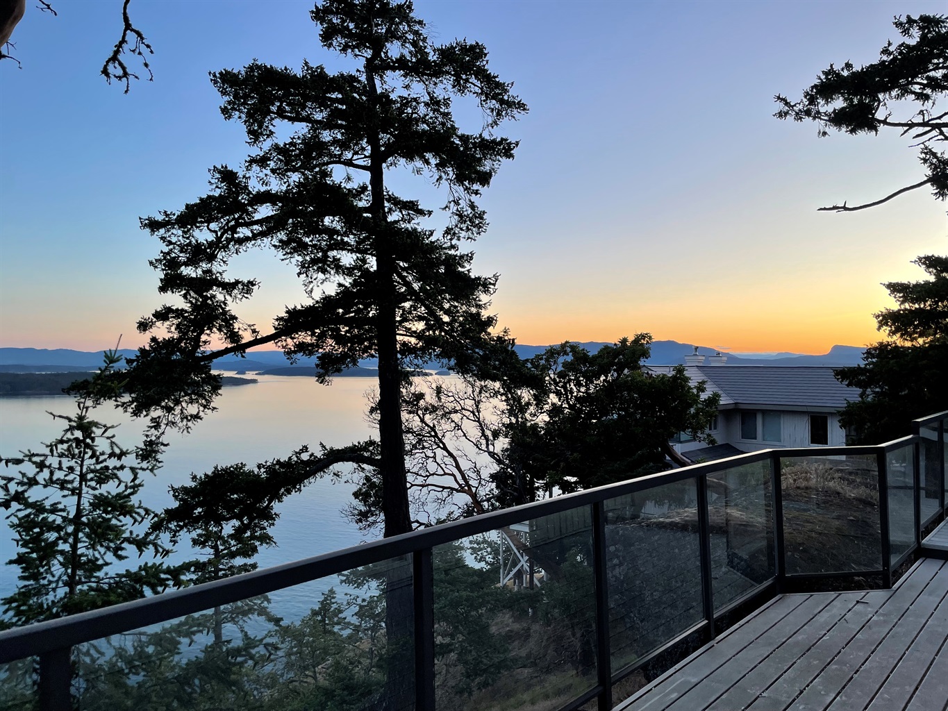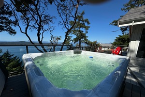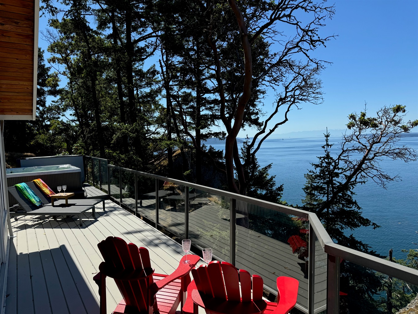 Enjoy a serene retreat at Sahhali on the Bluffs, Pender Island. This tranquil Cottage offers spectacular 180-degree views of the Salish Sea, facing south towards Vancouver Island, USA, Swartz Bay, and Salt Spring Island. Observe passing Orcas and Humpback whales, Bald eagles, Turkey vultures, and swallows in their natural habitat. Encounter local deer grazing nearby. Engage in hiking and cycling activities, followed by relaxation in your private hot tub while admiring the beautiful scenery in complete tranquillity. As an extension to the cottage, this configuration offers an additional West suite with the same view in the main building on the same property, providing a total capacity to house 7. Note: Fireplace is for decor only