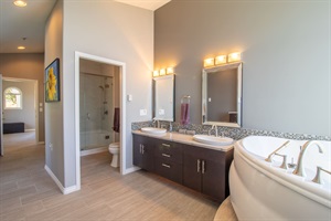 The Ritual of Getting Ready: Enjoy the convenience of a spacious his-and-hers vanity stocked with curated boutique bath products and plush towels.